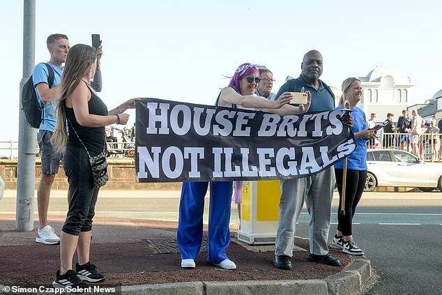 More than 40 anti–immigration demonstrators confronted almost 30 activists holding Stand Up to Racism placards outside the Royal Beach Hotel. Some on the anti–immigration side hung a banner which said 'protect our children' outside the hotel.