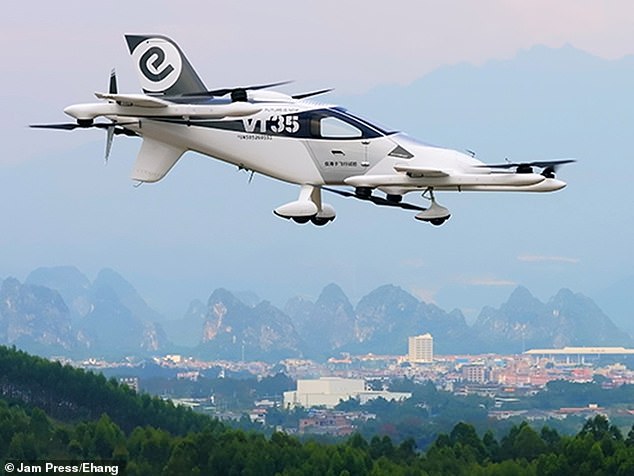 EHang said: 'With its autonomous flight capability, point-to-point efficiency, and eco-friendly electric propulsion, VT35 is set to play a pivotal role in advancing the low-altitude aerial mobility ecosystem from urban to intercity corridors.