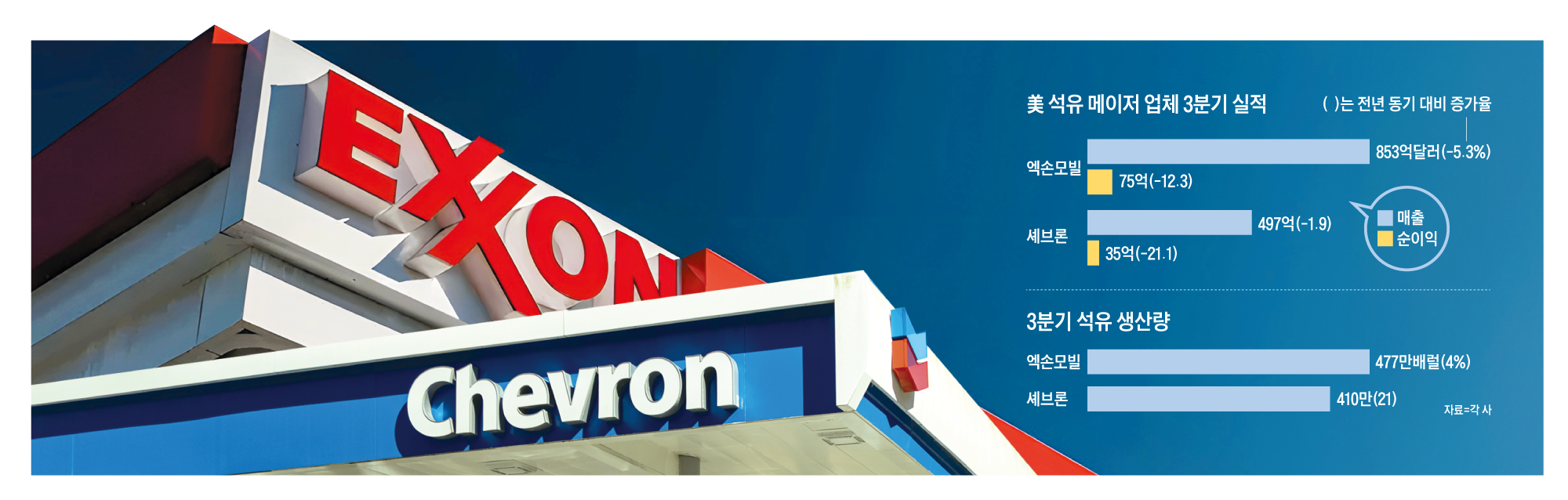 Amid a worldwide surplus of crude oil that has caused international oil prices to drop by roughly 25% from their peak levels, ExxonMobil and Chevron, the two biggest U.S. oil corporations, revealed their third-quarter results for this year on the 31st of the previous month. Both firms reported weaker key financial indicators, such as revenue and net profit, when compared to the same period in the prior year. ExxonMobil achieved revenue of $85.3 billion (about 125 trillion South Korean won) during the third quarter of this year, representing a 5.3% decline from the same time last year. Net profit decreased by 12.3% to $7.5 billion. Chevron's revenue fell by 1.9% year-over-year to $49.7 billion, while net profit dropped by 21.1% to $3.5 billion.