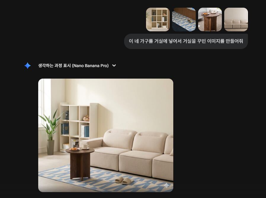 Five seconds later, the AI named 'Gemini' generated an image of a living room that included all four pieces of furniture. The carpet's design and hue were identical, and the items on the bookshelf from the original picture were also exactly duplicated. In addition to the user-supplied furniture, the AI added slippers, a plant, and some snacks on the side table, resulting in a realistic photograph similar to those seen on online furniture retailers.