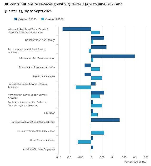 Services were the primary driver of growth in the most recent quarter, as business rental and leasing, live events, and retail showed strong performance, although this was somewhat balanced by declines in R&D and hair and beauty salons.