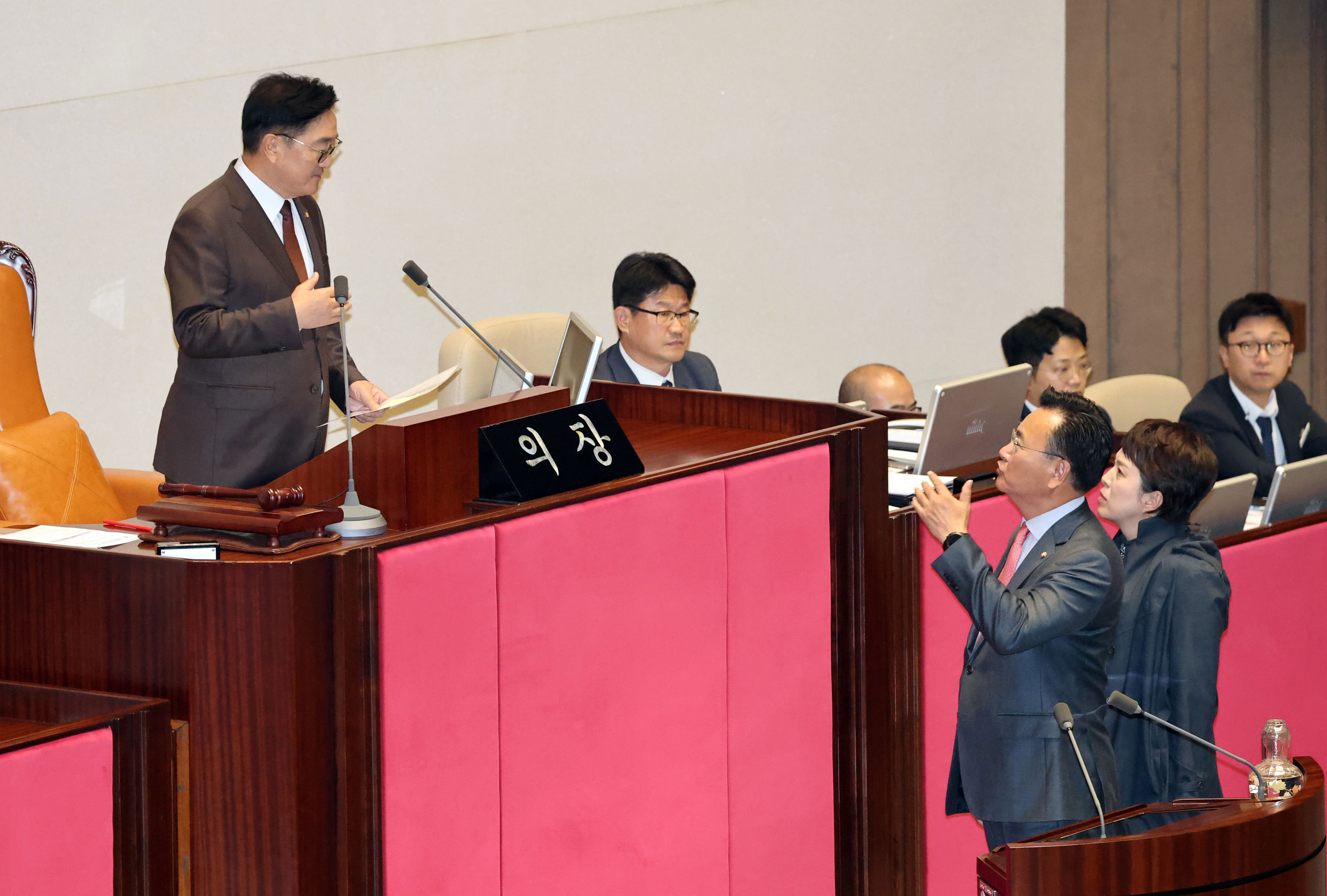 Deputy Chief Floor Leader for Operations Yoo Sang-beom and Deputy Chief Floor Leader for Policy Kim Eun-hye also left the session as a form of protest. When Yoo asked, "This is already the second time. You are aware of that, aren't you?" Speaker Woo replied, "I will make sure there is no third instance. I have made it clear that this cannot occur again. As Speaker, I believe it is essential to maintain the authority of the plenary session. Please understand."