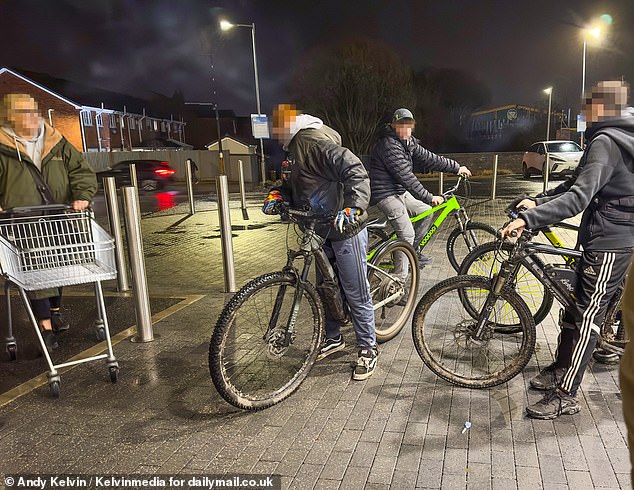 The group began their night congregated in the entrance of a Lidl supermarket, with one boy appearing to ride his mountain bike into the doorway.